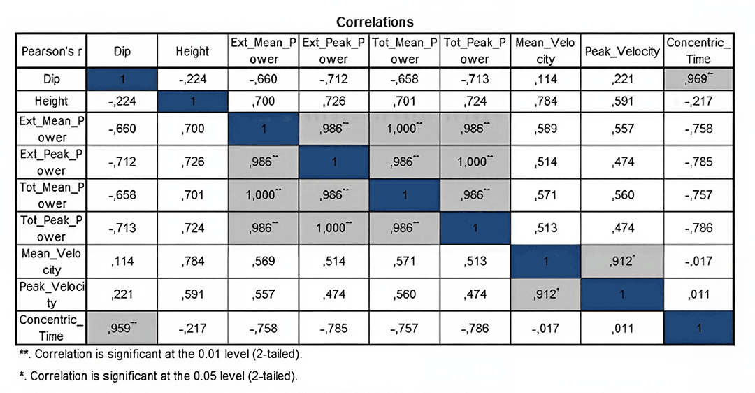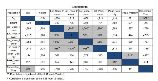 Height has pretty high correlation to power measures (0.70 – 0.72), and mean velocity (0,78).